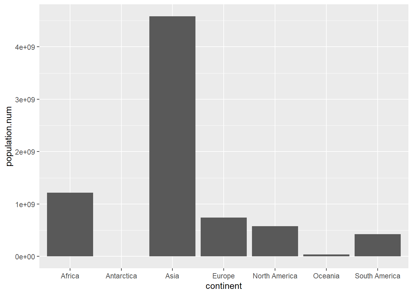 # with fixed populaton datacont.pop <-ggplot() +geom_col(data = cont,mapping =aes(x = continent, y = population.num))cont.pop