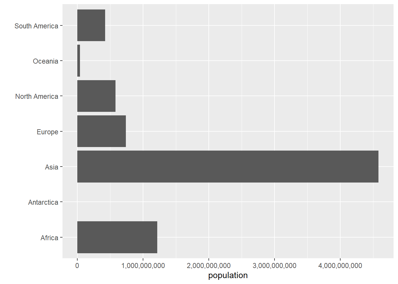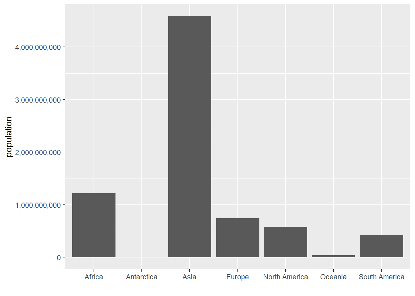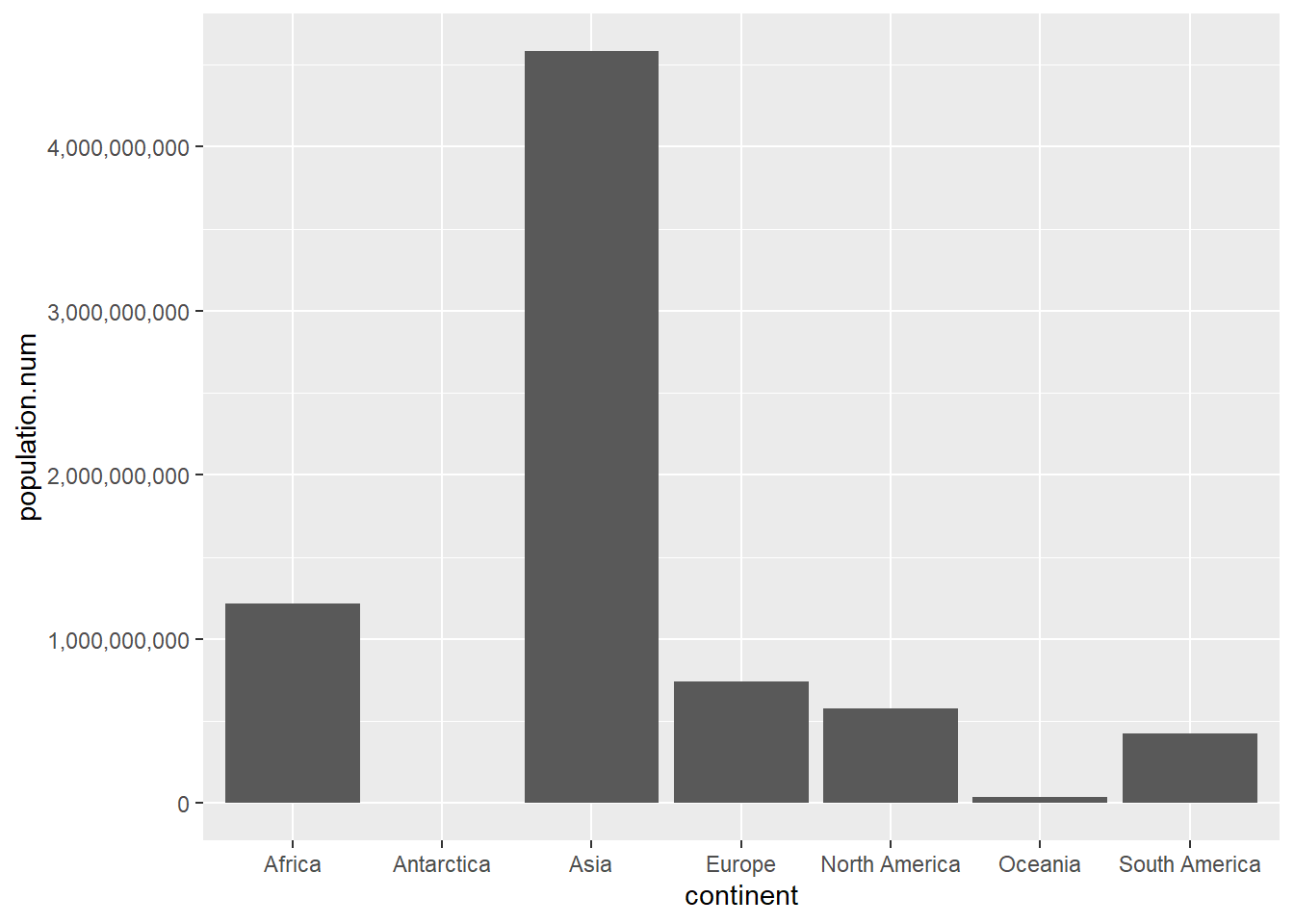 ## lets make y axis legiblecont.pop <-ggplot() +geom_col(data = cont,mapping =aes(x = continent, y = population.num)) +scale_y_continuous(labels = comma)cont.pop