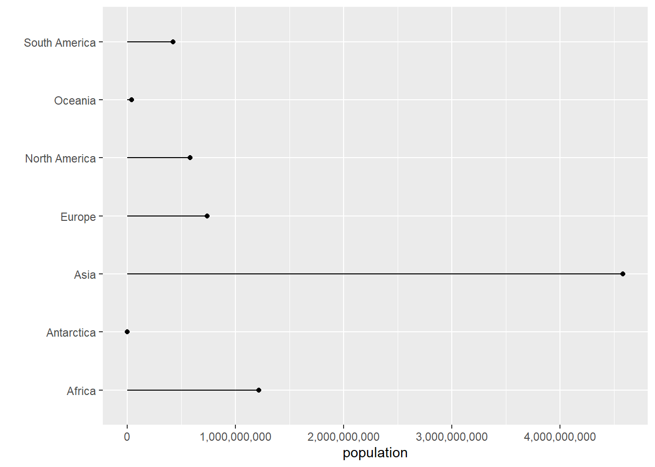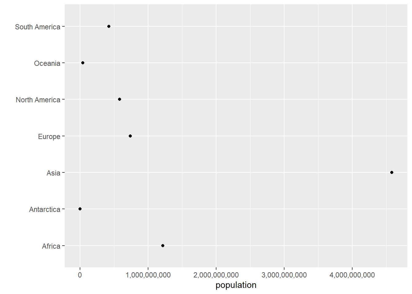# just the dotcont.pop <-ggplot() +geom_point(data = cont, mapping =aes(x = population.num, y = continent)) +scale_x_continuous(labels = comma) +labs(x ="population",y ="") cont.pop
