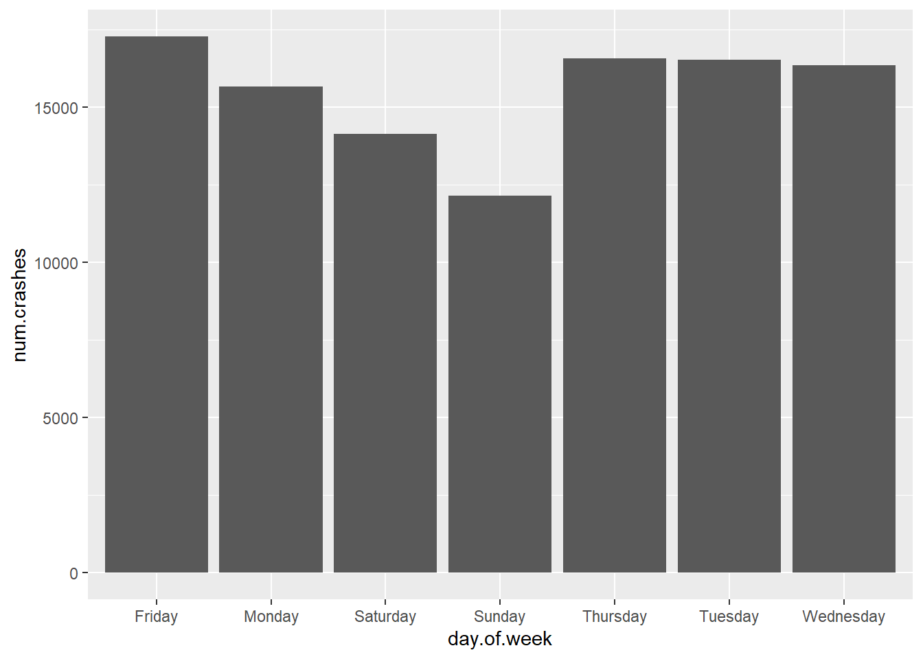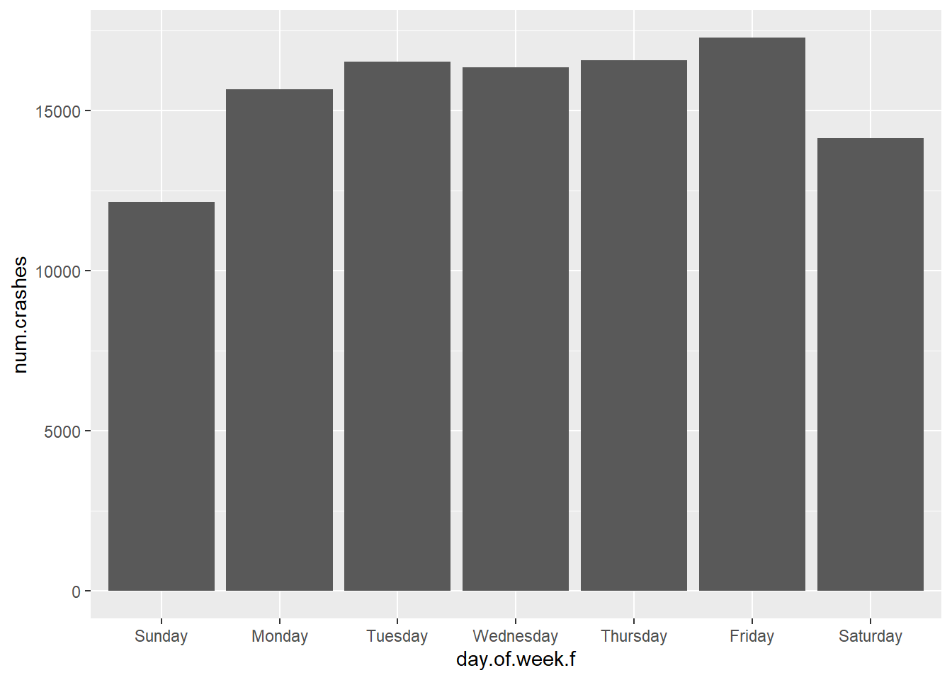 # re-order days of the weekcrash.weekday$day.of.week.f <-factor(x = crash.weekday$day.of.week,levels =c("Sunday","Monday","Tuesday","Wednesday","Thursday","Friday","Saturday"))