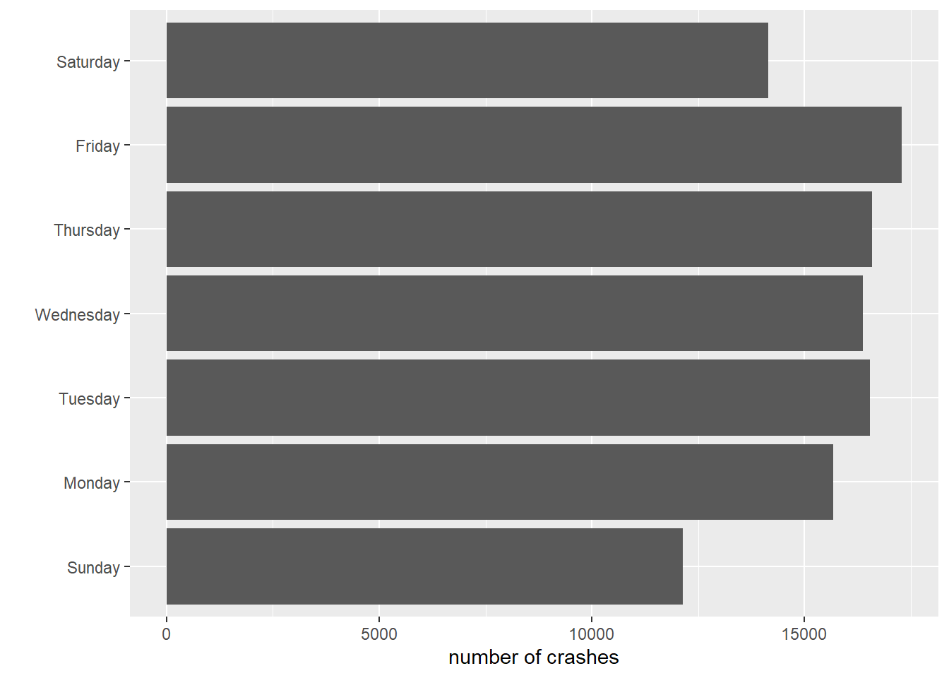 # fix a few more things upcdow <-ggplot() +geom_col(data = crash.weekday,mapping =aes(x = day.of.week.f, y = num.crashes)) +labs(x ="",y ="number of crashes") +coord_flip()cdow