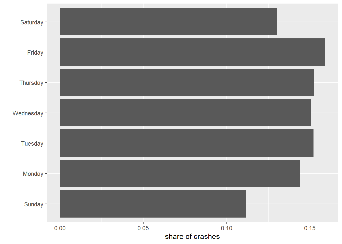 # calculate shares by day of weekcrash.weekday <-mutate(.data = crash.weekday,total.crashes =sum(num.crashes))crash.weekday$daily.share <- crash.weekday$num.crashes / crash.weekday$total.crashescrash.weekday