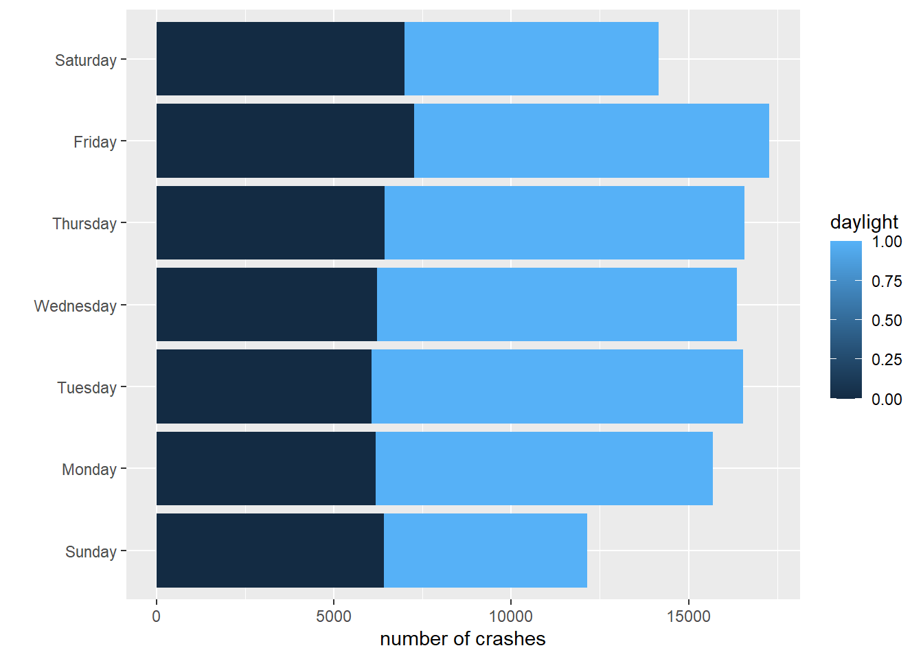 # stack those barscdow <-ggplot() +geom_col(data = crash.weekday.light,mapping =aes(x = num.crashes, y = day.of.week.f, fill = daylightf)) +labs(x ="number of crashes",y ="") cdow