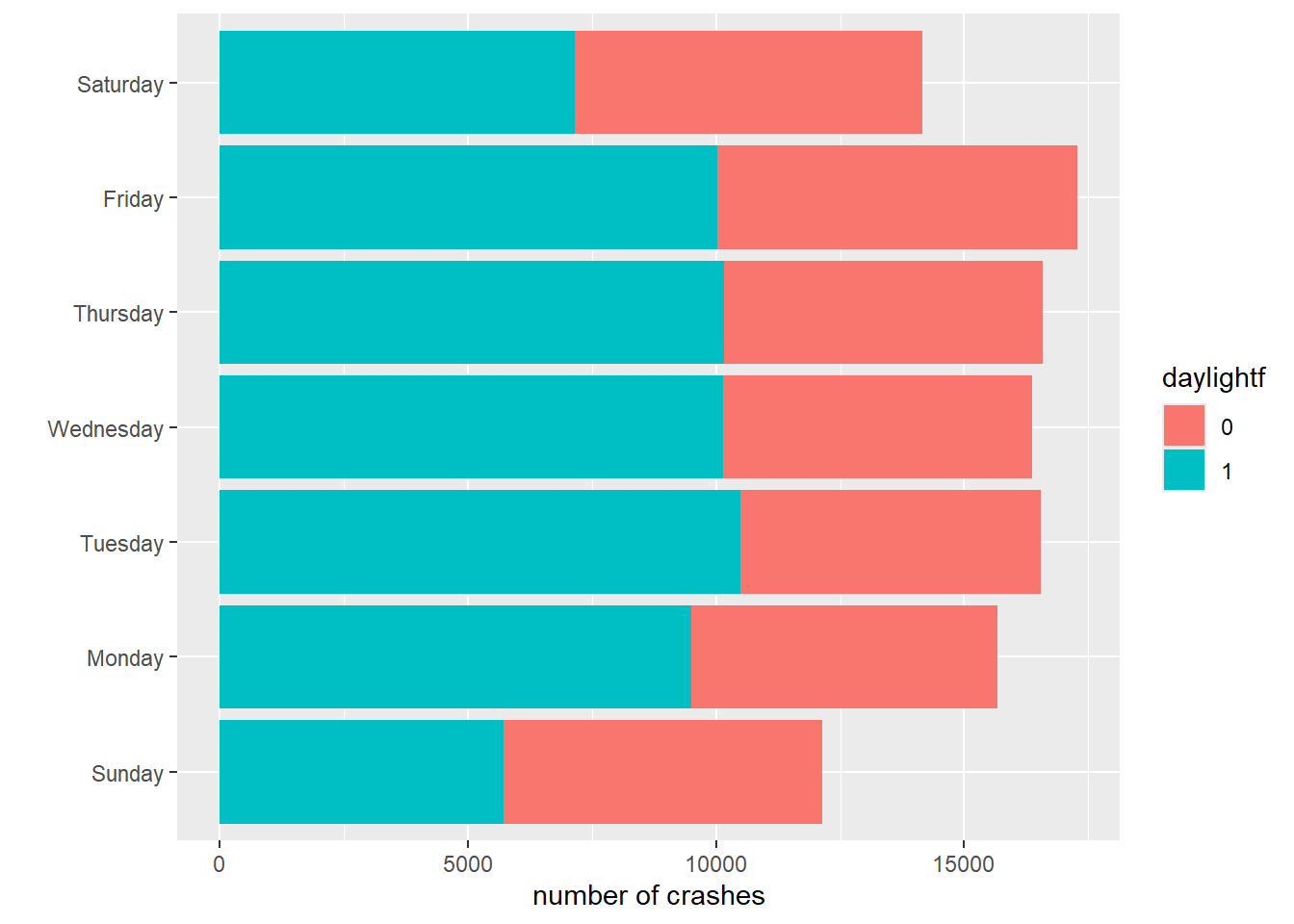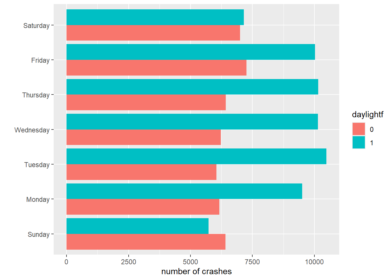 cdow <-ggplot() +geom_col(data = crash.weekday.light,mapping =aes(x = num.crashes, y = day.of.week.f, fill = daylightf), position =position_dodge()) +labs(x ="number of crashes",y ="") cdow