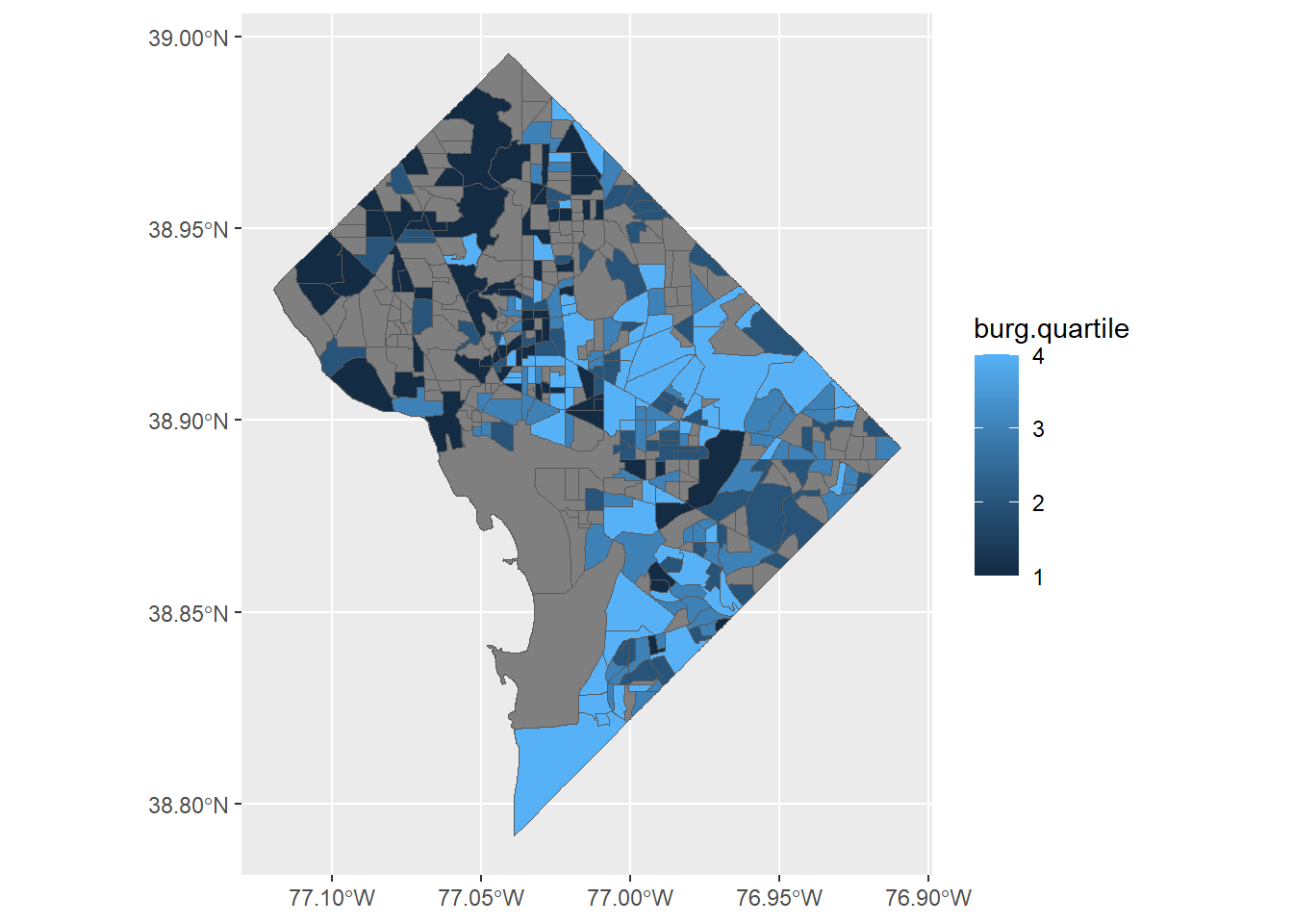 # another attempt# the -white- was inside the aes call, which it should not have been# using the new quartiles solves the previous problemburg2 <-ggplot() +geom_sf(data = bg2010.c2, mapping =aes(fill =as.factor(burg.quartile2)), color ="white") +scale_fill_manual(values = four.colors) +theme(panel.background =element_rect(fill ="transparent",colour =NA),plot.background =element_rect(fill ="transparent",colour =NA))burg2
