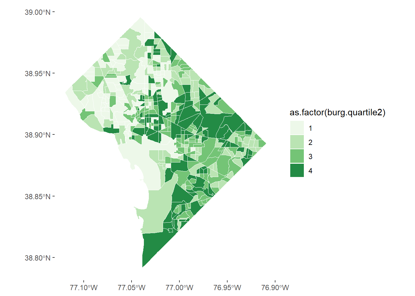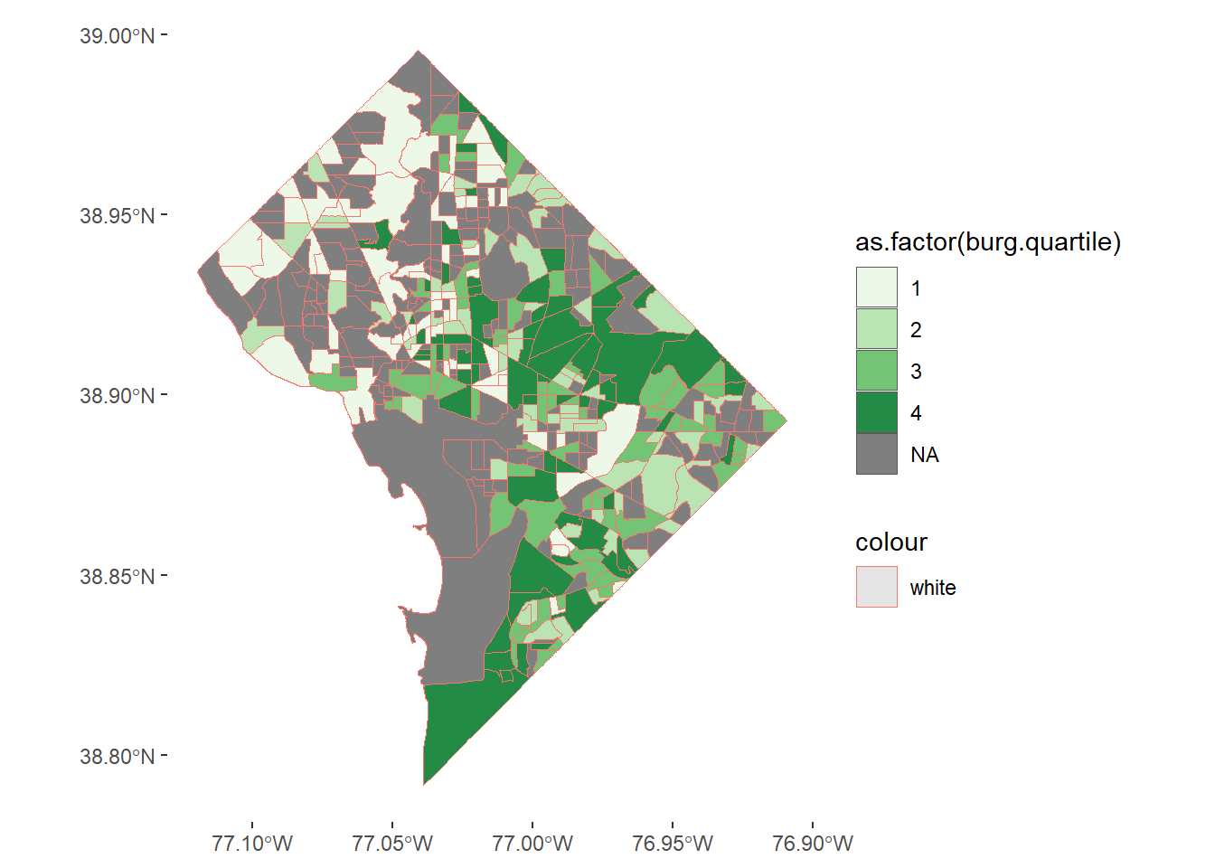 # make graph with categorical legend## still need to get rid of NAs and make borders whiteburg <-ggplot() +geom_sf(data = bg2010.c2, mapping =aes(fill =as.factor(burg.quartile), color ="white")) +scale_fill_manual(values = four.colors) +theme(panel.background =element_rect(fill ="transparent",colour =NA),plot.background =element_rect(fill ="transparent",colour =NA))burg