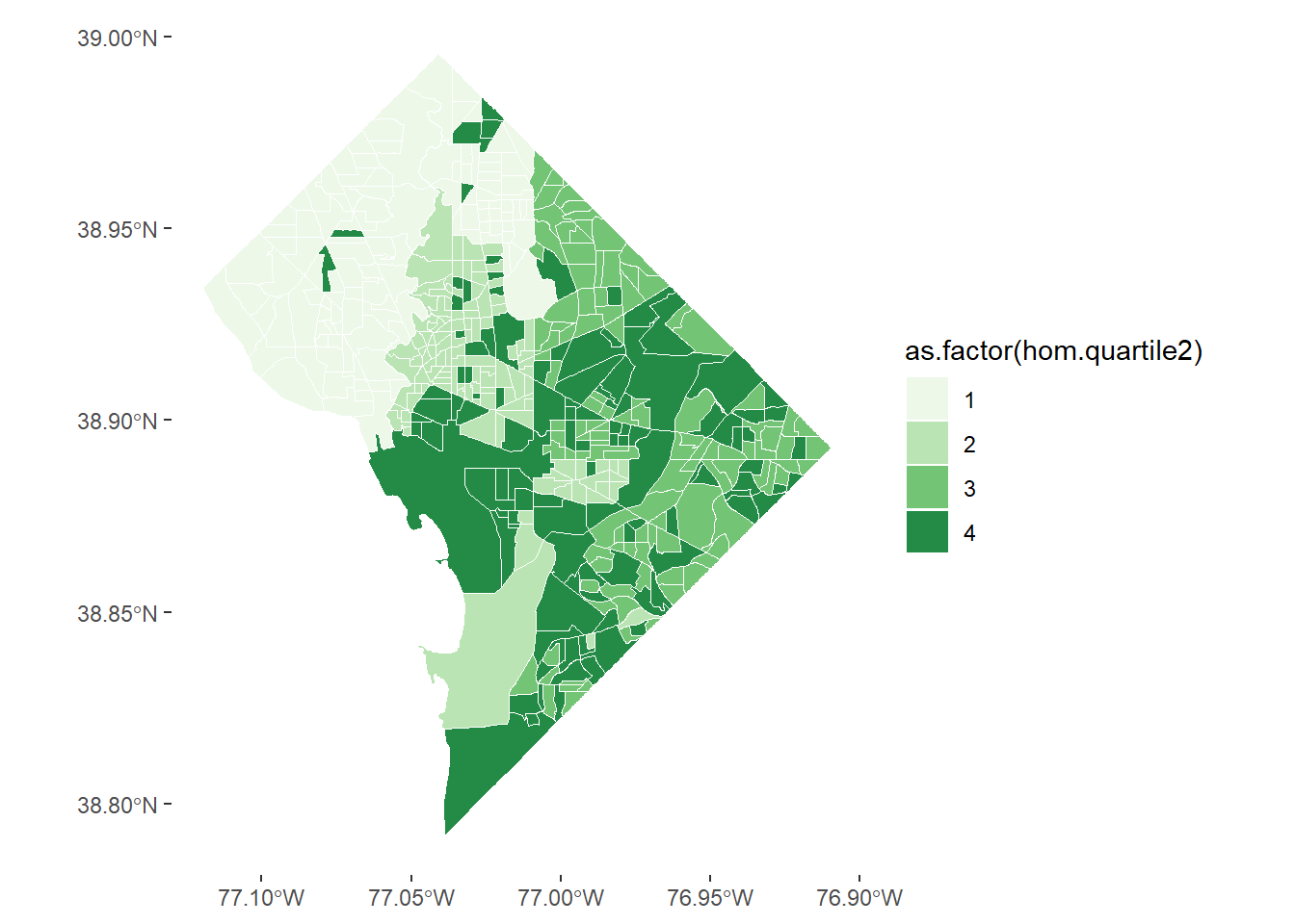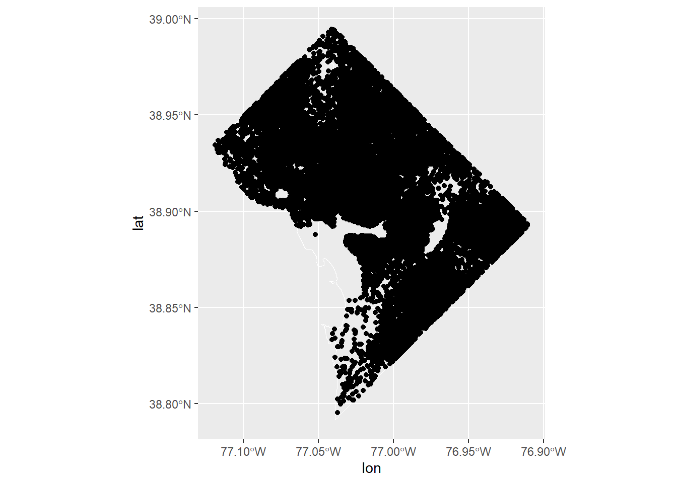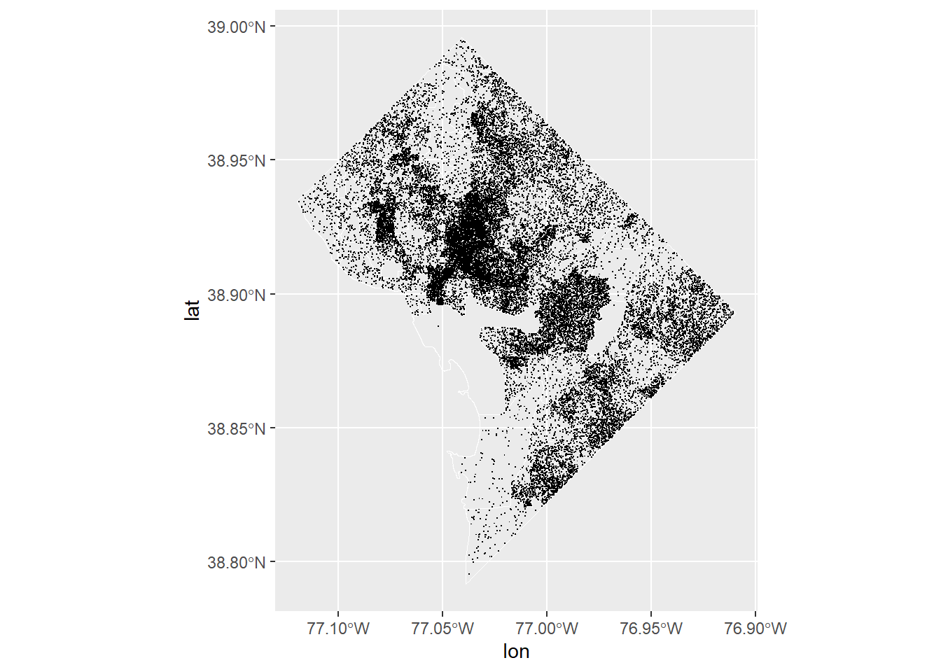 This step will generate many repeated warning that “although coordinates are longitude/latitude, st_intersects assumes that they are planar.” This basically means that R is putting spherical coordinates on a flat plane. For an area as small as DC, this is not at all worrying.