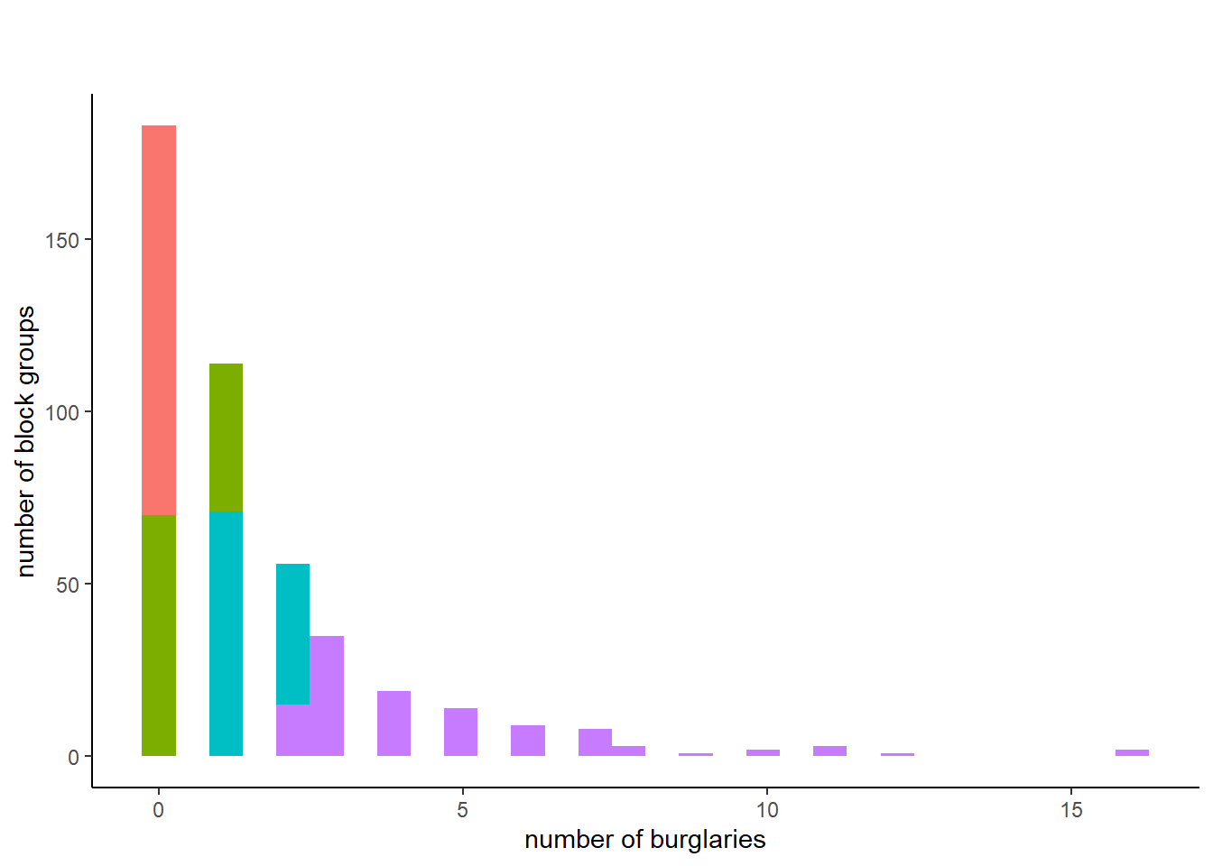 # note that this wont work with the fill as a numeric thinglego <-ggplot() +geom_histogram(data = bg2010.c2, mapping =aes(x = BURGLARY, fill =as.factor(burg.quartile2))) +theme(legend.position ="none",axis.line.x =element_line(color="black"),axis.line.y =element_line(color="black"),panel.background =element_rect(fill ="transparent",colour =NA),plot.background =element_rect(fill ="transparent",colour =NA)) +labs(title ="", subtitle ="", x ="number of burglaries", y ="number of block groups")lego