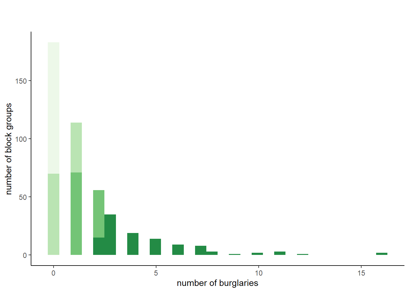 This is sort of successful. The graph is on its way to being ok, but the output reveals a glaring problem for this type of representation. Some block groups with just one burglary are assigned to the first quartile. Other block groups with just one burgalry are assigned to the second quartile. This makes the legend too confusing.