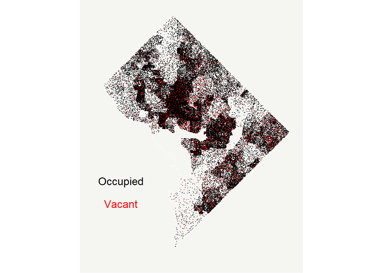 # now plot it with the DC bg map behind itoh.map <-ggplot() +geom_sf(data = bg2010, fill ="transparent", color ="white") +geom_point(data = hhdats.df, mapping =aes(x=lon, y=lat, color = htype), shape =".") +scale_color_manual(values =c("black","red")) +labs(x="",y="") +theme(plot.background =element_rect(fill ="#f5f5f2", color =NA), panel.background =element_rect(fill ="#f5f5f2", color =NA), panel.grid =element_blank(),legend.background =element_rect(fill ="#f5f5f2", color =NA),legend.position ="none",axis.ticks =element_blank(),axis.text =element_blank()) +annotate(geom ="text", label ="Occupied", x =-77.1, y =38.85, color ="black", size =5) +annotate(geom ="text", x =-77.1, y =38.83, label ="Vacant", color ="red", size =5) oh.map